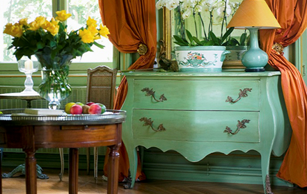É um estilo que remete ao clássico, algo antigo que está em bom estado de conservação. Podemos utilizar composições românticas com paletas em tons pastéis, mobiliário com cores suaves e papéis de parede florais, ou ousar e trabalhar com uma paleta mais sóbria (laranja, vermelho, marsala), sofá capitonê em couro, madeira escura e papéis em arabesco.